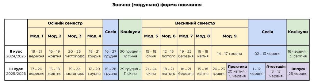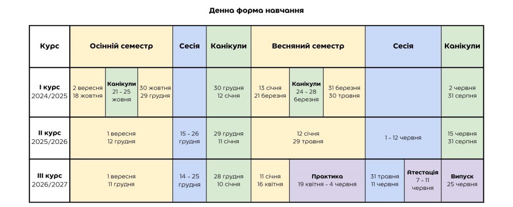 Вступники після 11 класу або з дипломом кваліфікованого робітника можуть обрати денну чи заочну форму навчання. Денна форма передбачає пари з 9:30 від понеділка до п’ятниці. Заочна форма – щомісяця чотири дні поспіль змістовно насичені й інтенсивні теоретико-практичні заняття з викладачами, щоб ефективно поєднувати роботу і навчання.