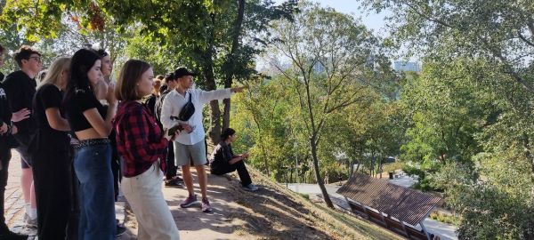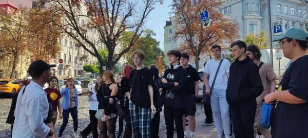 На Михайлівській площі розпочалася друга частина екскурсії – пішохідна. Першою зупинкою стала Андріївська церква, де хлопці та дівчата згадували класику українського кіно та міркували, чого культова споруда не має дзвіниці.