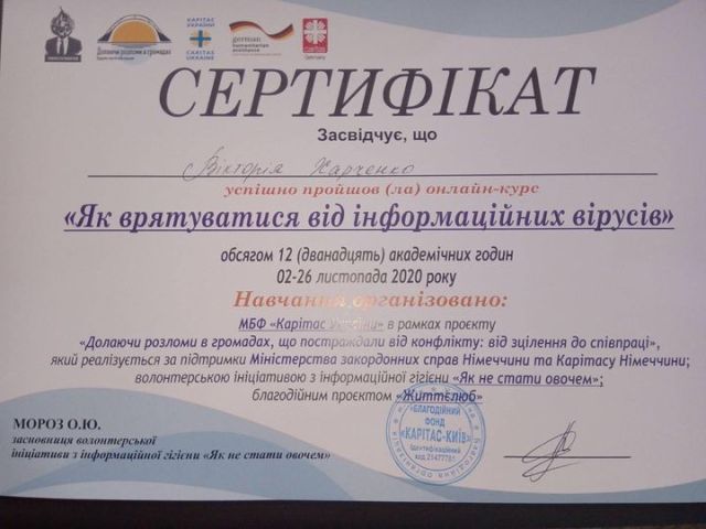 Проте знання повинні бути не лише актуальними, але і перевіреними, бо в світі тотальної глобалізації та інформатизації дуже легко загубитися серед численних «фейків» та «побрехеньок». Саме тому місячний курс із інформаційної гігієни, засвоєний Вікторією Євгеніївною Харченко, є практичним і корисним не лише для самої здобувачки, але і для студентів, яз якими вона працюватиме.