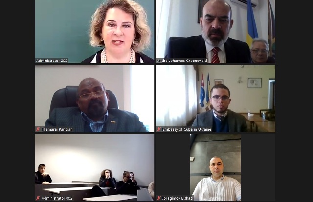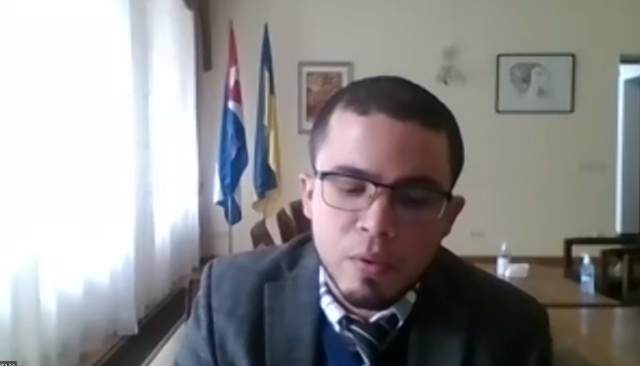Пан Альберто Адріан Фуентес Акоста, III секретар-керівник із консульських питань Посольства Республіки Куба в Україні в своїй доповіді зазначив, що єдина можливість вберегтися від жахливих наслідків пандемії – зупинити її. Це робить пріоритетним медичний ресурс, зокрема виробництво вакцинації. Пан посол розповів, яким чином Куба налагодила випуск вакцин і знизила гостроту кризових наслідків, пов’язаних із пандемією. В кінці доповідач закликав всіх об’єднатися і спільно протистояти загрозі Covid19.