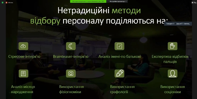 Проблема організації роботи із персоналом також була піднята Ковтонюк Дариною, студенткою Житомирської філії. В доповіді «Нетрадиційні методи підбору персоналу» вона презентувала нетрадиційні методики підбору персоналу на підприємстві, зокрема стрес-інтервью, аналіз відбитків пальців, фізіогноміка та інші. Подібний характер носила доповідь Дундяк Анастасії («Створення системи мотивації на підприємстві архітектурної візуалізації»)